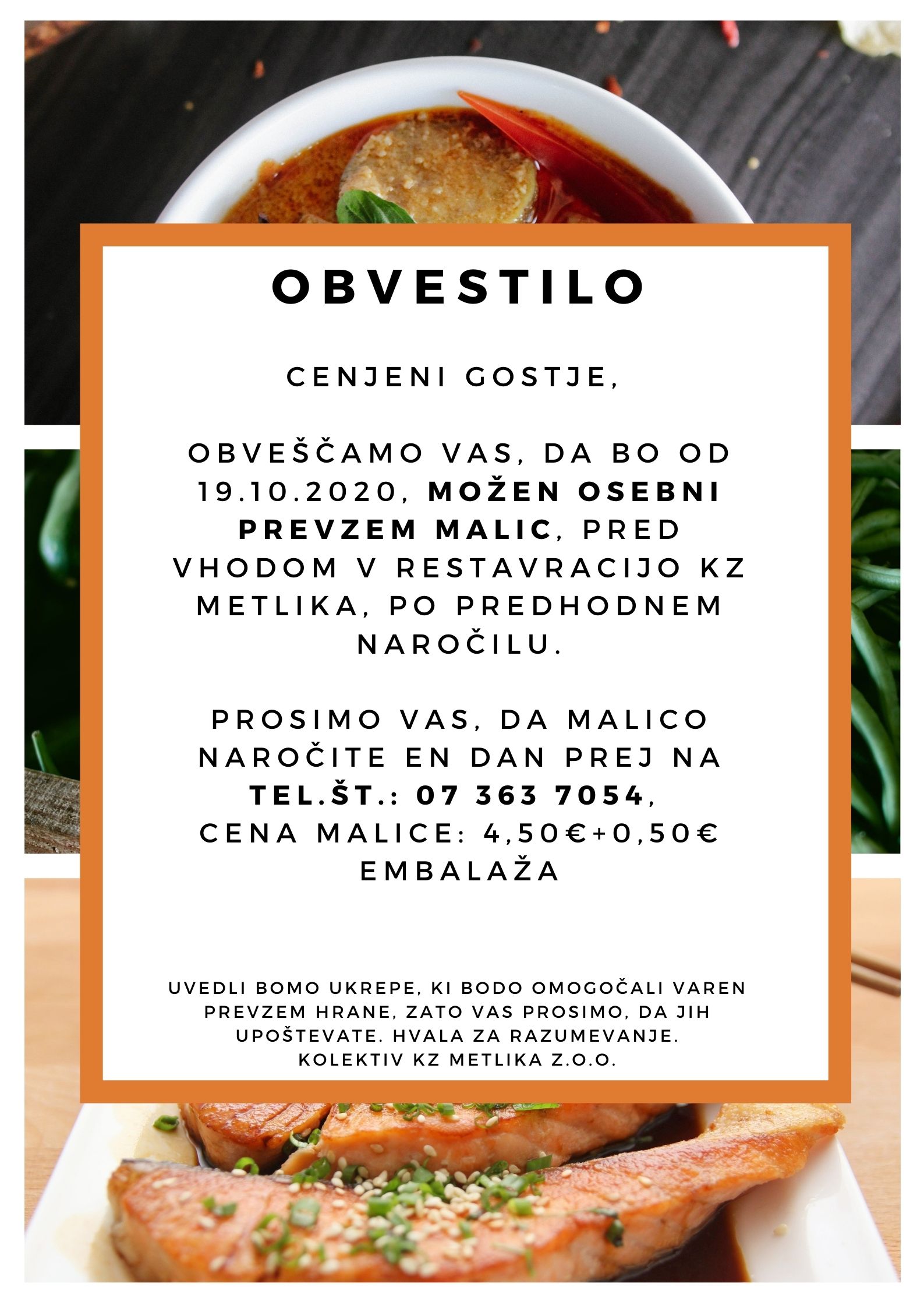 Obveščamo vas, da bo od 19.10. možen osebni prevzem malic, pred vhodom v restavracijo KZ Metlika, po predhodnem naročilu. Prosimo vas, da malico naročite en dan prej na tel. št. 07 363 7054. Cena malice je 4,50 € + 0,50 € embalaža. Priloge OBVESTILO O OSEBNEM PREVZEMU MALIC.jpg350.73 KB